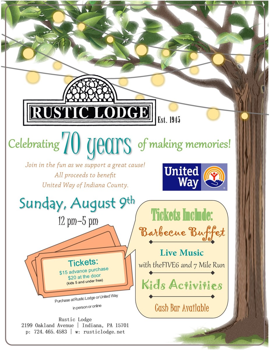 The Rustic Lodge is celebrating 70 Years of making memories!  This promises to be a fun event with Live Music, a Barbecue Buffet & Children's Activities!  Proceeds from this event will benefit the United Way of Indiana County!